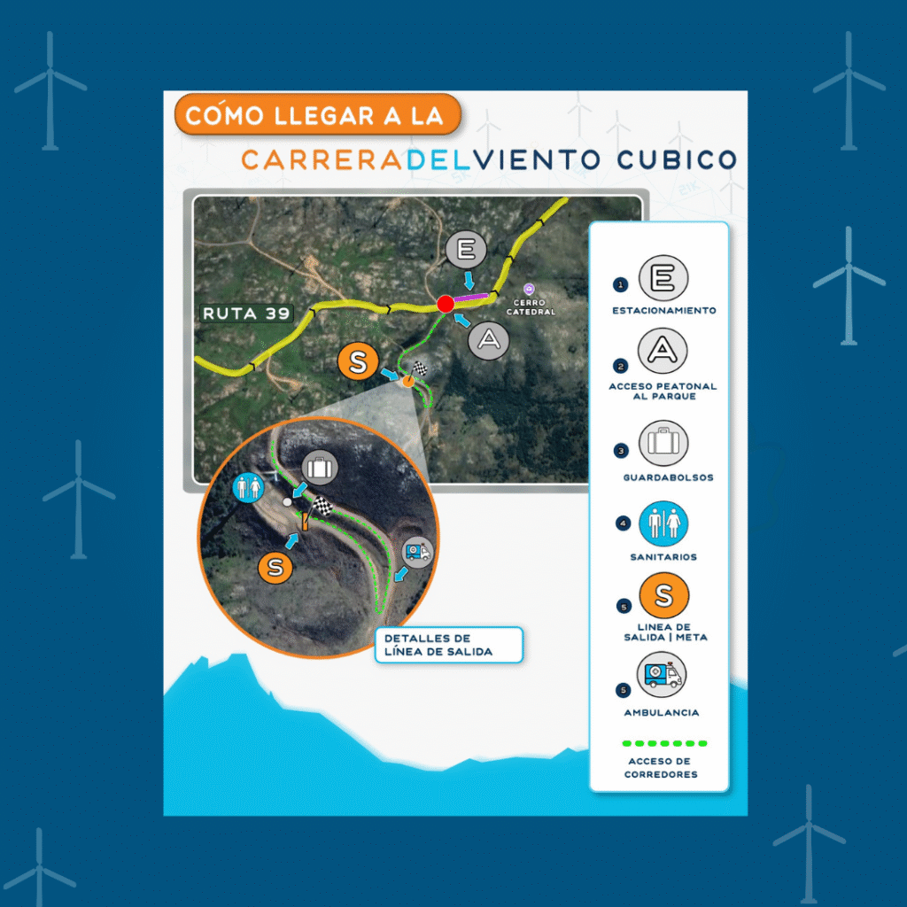 Los corredores, trotadores y caminantes disfrutarán del paisaje único entre aerogeneradores de más de 100 metros de altura, rodeados por las sierras de Carapé.