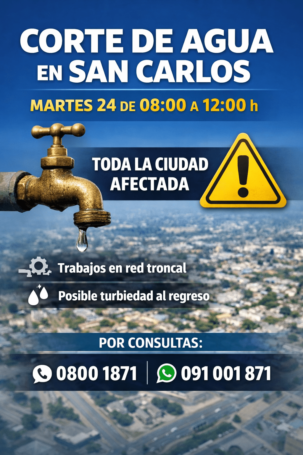 El corte de agua en San Carlos afectará a toda la ciudad este martes 24 desde las 08:00. La interrupción se extenderá hasta el mediodía por trabajos en la red.