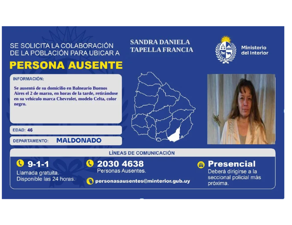 Las autoridades solicitan la colaboración de la población para ubicar a Sandra Daniela Tapella Francia, de 46 años, en el departamento de Maldonado. Persona ausente Sandra Tapella-2
