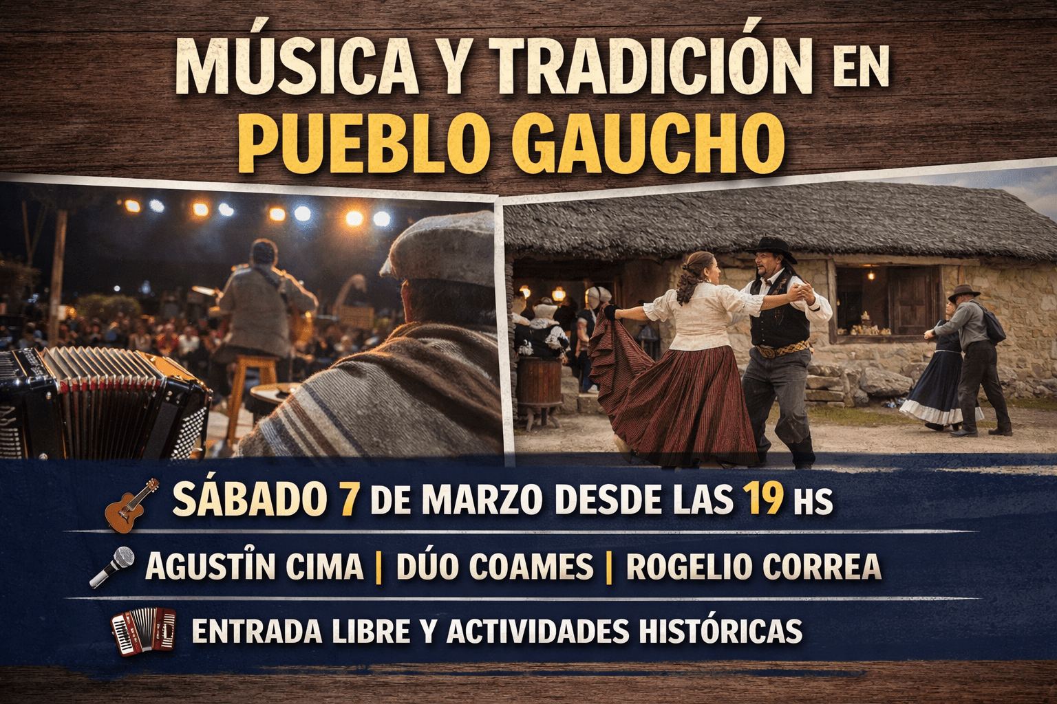 Este sábado 7 de marzo, el Parque Temático Pueblo Gaucho tendrá una nueva noche de música popular uruguaya con entrada libre y gratuita. El predio está en avenida Elías Regules y calle Los Tilos, en la zona de Rincón del Indio.