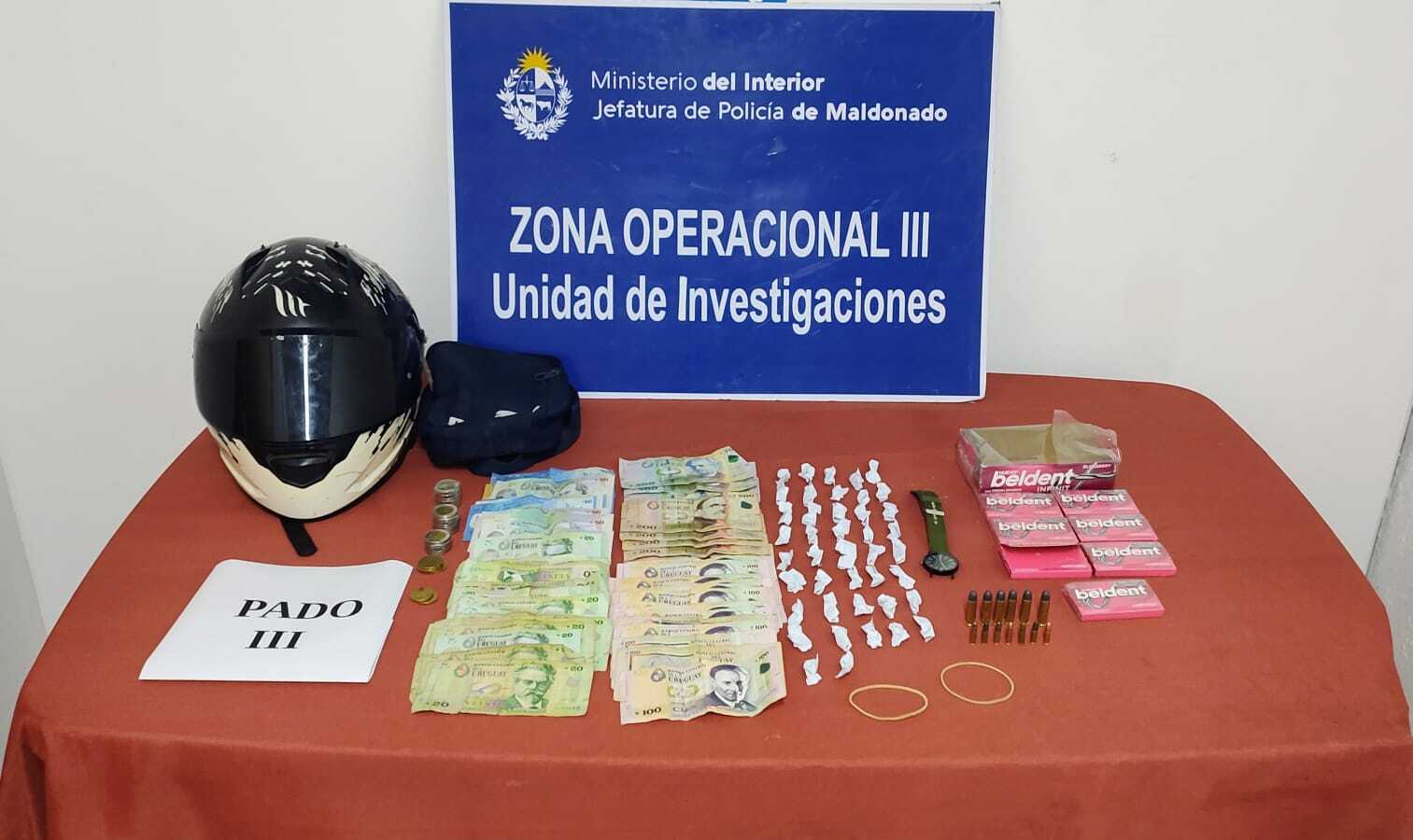 Durante la detención, los policías le incautaron un morral con un revólver calibre .38 marca Taurus, envoltorios con cocaína, $6.134 pesos uruguayos y varias municiones calibre .38 y .22.